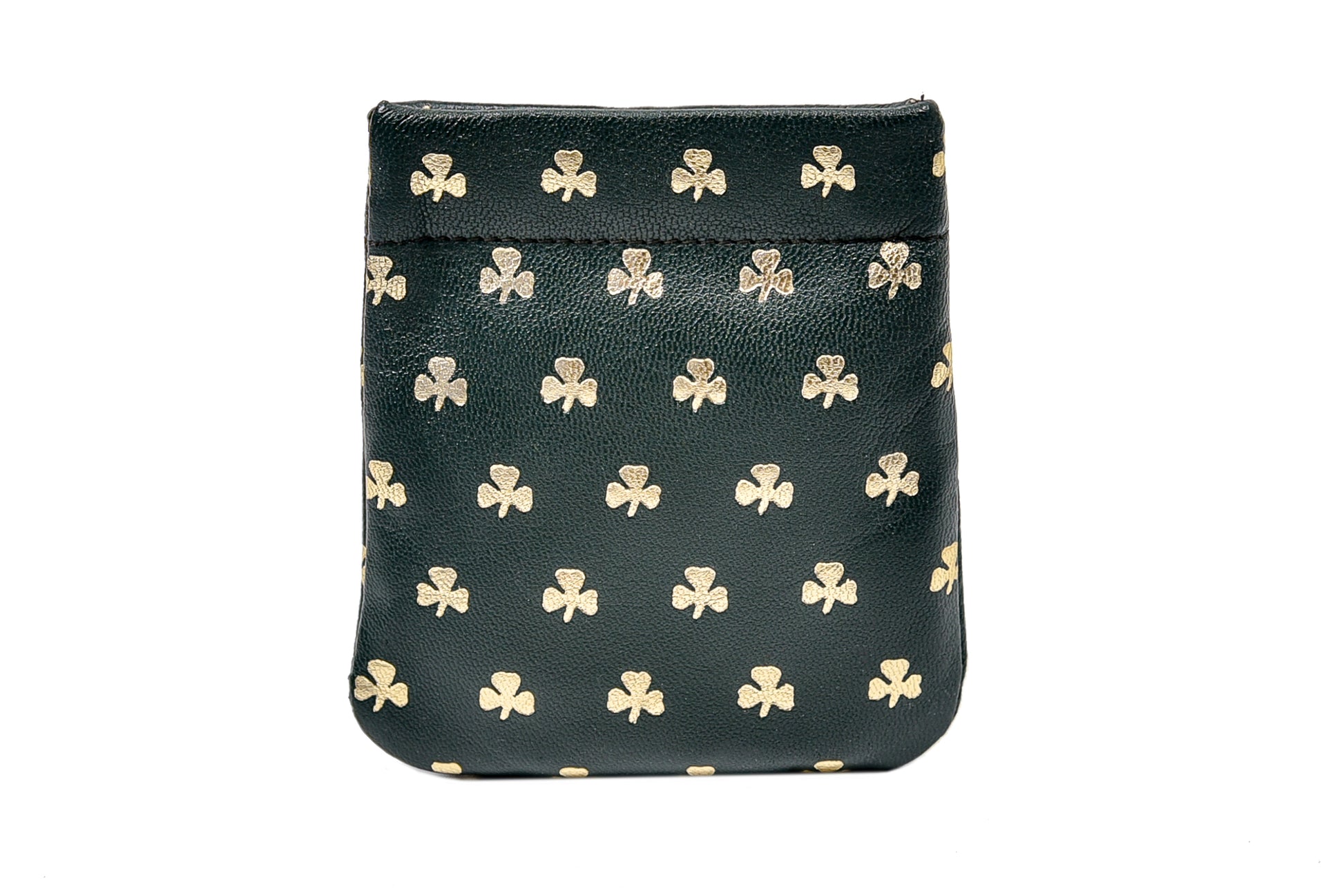 Never find your change scattered through your bag again with this super little purse that features a sprung lip opening. Gently squeeze the sides together and hey presto! To close simply let go. Decorated with shamrocks in gold on a field of luxurious green leather.